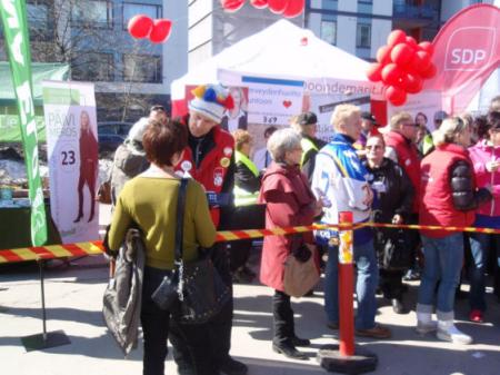 Sieltä sitten yritimme saada ihmisiä juttelemaan kanssamme ja tuntui tosiaan eläintarhameiningiltä. Yksi mieshenkilö - ilmeisesti demarikannattaja - huomasi viereiseltä vihreiden vaaliteltalta oikeusministeri Tuija Braxin ja meni pyytämään häneltä apua.