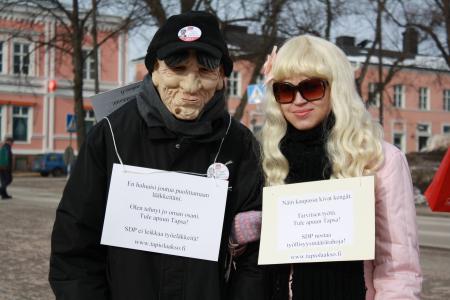 Keitä he oikein ovat ja miten he toimivat? Siinä oli kysymystä purtavaksi toritilaisuudessa Tapio Laaksolle, joka marssitti vaalikiertueellaan kiertävät ”nykyajan kurjat”, vanhukseksi ja nuoreksi naiseksi puetut vaalityöntekijänsä laput kaulalla kertomaan käytännössä siitä, miten nämä kaksi ryhmää ovat tippuneet porvarihallituksen kurjistamispolitiikan takia lähelle köyhyysrajaa, ilman että kukaan välittää heistä tai syntyneestä tilanteesta.
